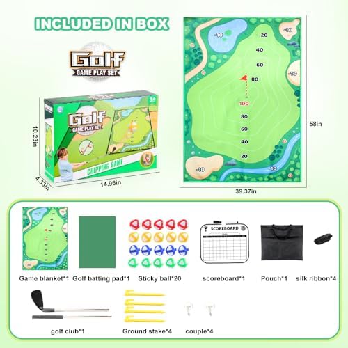【 Products include 】The chipping golf mat set is a great indoor and outdoor golf game for the whole family,suitable for beginners and skilled players to practice golf. Packed in a beautiful box,golf set includes a 60×40 inches green chipping golf mat, 20 balls, 4 ground stakes, 1 chipping mat, 1 golf stick, 1 storage bag 1 score board and 4 straps,Four hook