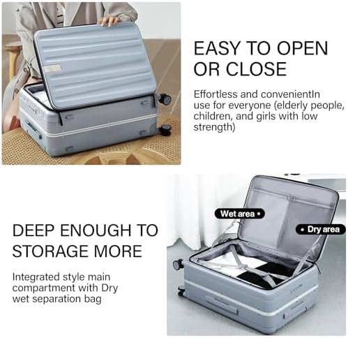 【CREATIVE FRONT OPENING】 Leading the future opening and closing method which is effortless to open or close the suitcase, not only is it easy to load, but it also saves space. This design solves the problem that traditional luggage separated 2 compartments of heavy load then it’s difficult to open and close. Importantly, it also avoid the displacement of items.