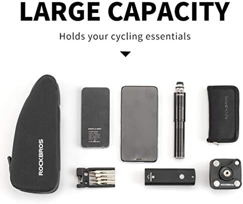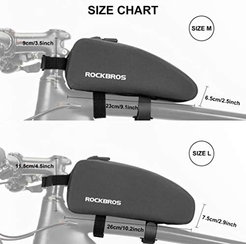 LARGE CAPACITY: ROCKBROS top tube bike bag is large enough to holds your phone, wallet, keys, energy bar, snacks, gloves, spare tube, tire levers and a multi tool. Medium size could holds under 6.0” phones, Large size could hold under 6.5” phones.