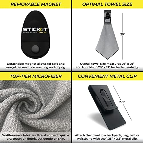 STICKIT Multi-Function Microfiber Magnetic Towel is made for our customers convivence. It is ideal for multiple situations such as Outdoors, Gym Workout, At Home or On the Go. Use it on the court or field with easy attachment to any metal surface or at home to stick to the grill or laundry machine. Colors come in black, white or grey. Have a towel where you need it, when you need it. It includes a metal clip for attaching the towel to your bag, backpack, belt or waistband. The magnetic is removable for safe machine wash and dry – easy cleaning. Perfect for camping, the gym, the Basketball court, the golf course, for your pet or anywhere you need a towel that can conviently attach around you.